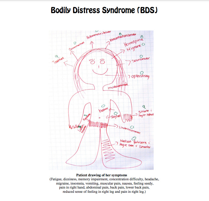 In 2016 the Somatic Distress and Dissociative Disorders working group proposed adding a new disorder to the eleventh revision of the International Classification of Diseases - Bodily distress syndrome (BDS). Finally, a syndrome I can get behind. The name alone feels satisfying. My body is, more than anything else, a source of great, unceasing distress. BDS is defined as “characterized by the presence of bodily symptoms that are distressing to the individual and excessive attention directed toward the symptoms, which may be manifest by repeated contact with health care providers. If a medical condition is causing or contributing to the symptoms, the degree of attention is clearly excessive in relation to its nature and progression. Excessive attention is not alleviated by appropriate clinical examination and investigations and appropriate reassurance. Bodily symptoms and associated distress are persistent, being present on most days for at least several months, and are associated with significant impairment in personal, family, social, educational, occupational or other important areas of functioning. Typically, the disorder involves multiple bodily symptoms that may vary over time. Occasionally there is a single symptom – usually pain or fatigue – that is associated with the other features of the disorder”
